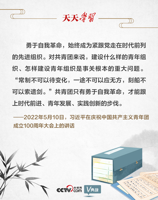 在庆祝中国共产主义青年团成立100周年大会上,习近平总书记强调:“勇于自我革命,始终成为紧跟党走在时代前列的先进组织。对共青团来说,建设什么样的青年组织、怎样建设青年组织是事关根本的重大问题。”他要求新时代共青团勇于自我革命,跟上时代前进、青年发展、实践创新的步伐。