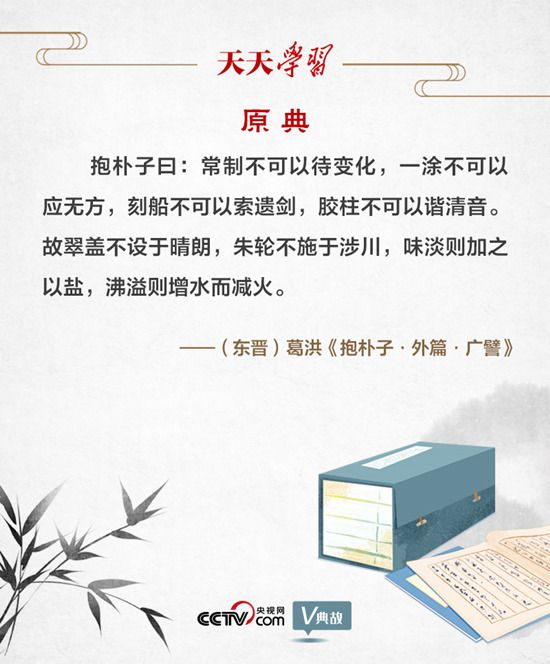 在《抱朴子·广譬》中,葛洪提出:“常制不可以待变化,一涂不可以应无方,刻船不可以索遗剑。”涂,通“途”,道路。这句话的意思是,固定不变的制度不能应对千变万化的社会,一条道路不可以通达无数的目的地,在行船上刻记号无法找到落入水中的宝剑。后者讲的就是《吕氏春秋》中“刻舟求剑”的故事。