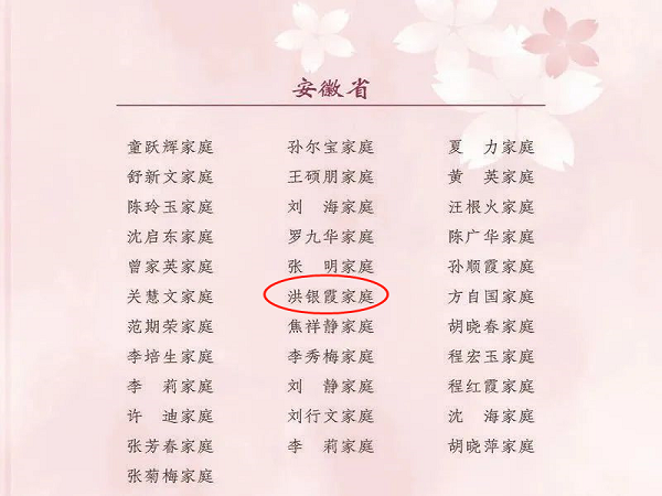 5.15国际家庭日前夕,全国妇联揭晓1000户全国“最美家庭”。这些家庭积极培育和践行社会主义核心价值观,在各行各业践行劳动精神、奋斗精神、奉献精神、创造精神、勤俭节约精神,展现了新时代家庭奋进新征程的良好精神风貌,体现了爱国爱家、相亲相爱、向上向善、共建共享的社会主义家庭文明新风尚,在传承中华民族家庭美德、厚植家国情怀、弘扬文明新风方面树立了标杆、作出了表率。其中,铜陵市洪银霞家庭荣获2023年度“全国最美家庭”。