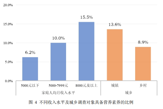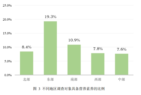 营养素养的区域分布与个体背景差异也呈现出明显不均衡趋势。报告显示,营养素养水平在东部地区、受教育程度高及经济条件较好的老年群体中更具优势。例如,东部地区调查对象的营养素养最高,达到19.3%,南部地区次之为10.9%,而北部、西部和中部地区均相对较低,分别为8.4%、7.8%和7.6%。受教育程度为高中及以上的调查对象,其营养素养具备率12.6%显著高于初中及以下组的7.6%。家庭人均月收入水平越高的调查对象,具备营养素养的比例越高,从低到高收入组分别为6.2%、10.0%和15.5%。